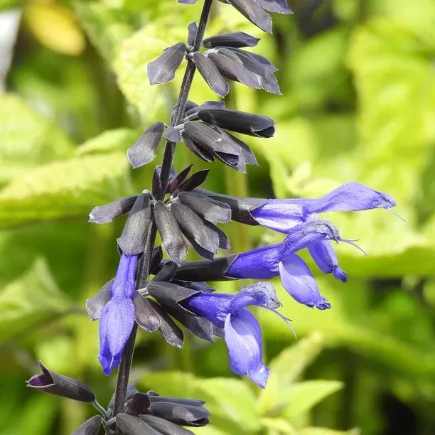 Black and Bloom sage is a herbaceous perennial that thrives in most of the UK and can be evergreen in the South West. The vivid blue flowers are held on tall, loose spikes and stand out from the black stems and calyxes from July to October. To 1.5m tall.