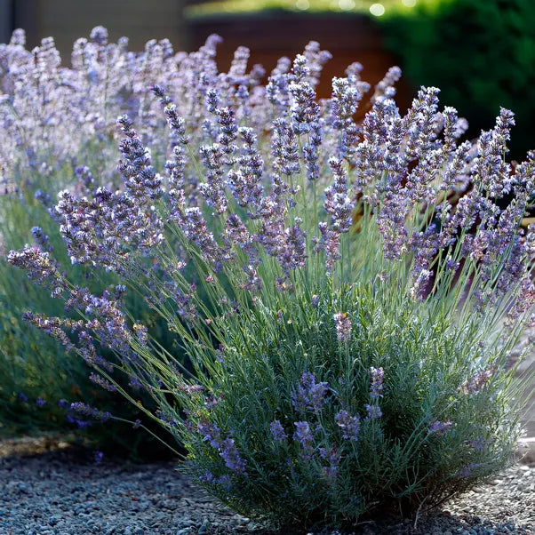 Around 30–45cm in both height and spread when established, making it one of the most compact English lavenders available. In a pot, it tends to stay at the smaller end of that range. In open ground with good drainage and full sun, it can reach the upper end. Either way, she stays tidy and does not splay open the way some larger lavenders do after a few years.
