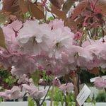 Prunus Shirofugen is a beautiful, spreading tree that is wider than it's tall when mature, with a distinctive flat canopy. In our range, the Shirofugen Cherry is the latest to come into bloom, with flowers that sometimes last into June. The large, double, fragrant white blossom open from pink buds and darken into pink again just before they fall. These contrast very well against the rich, copper coloured young leaves.